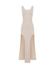 A DRESS THAT PLAYS WITH SHEERNESS AND SILHOUETTE. THE LONG, STREAMLINED CUT FEATURES UNEXPECTED SIDE SLITS THAT REVEAL THE LEGS AND ADD A TOUCH OF SENSUALITY AND FLUIDITY TO THE LOOK. THE SOFT FABRIC FALLS GENTLY OVER THE BODY, WHILE THE MINIMALIST DESIGN FEELS MODERN AND BOLD. PERFECT FOR THOSE WHO APPRECIATE THE AESTHETICS OF URBAN MINIMALISM WITH A HINT OF REBELLION.
